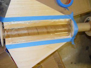 I built the fin can outside the rocket by cutting the fin slots all the way to the aft end of the airframe. Thanks to Jon Ruehle of Challenger for hosting a "Glass Class' at his shop in Houston, and to Tim Berg for the last minute suggestion, I glassed the fins onto the motor mount. (See Photos) I had first removed the glassine layer from the motor tube to establish prime adhesion.
