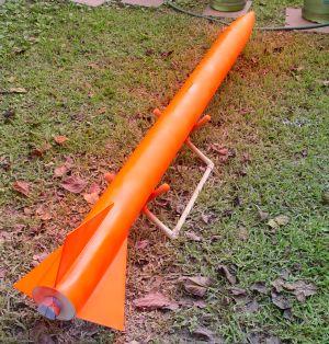 I coated the entire rocket with about two to three layers of Kilz white sandable primer. White was selected as it is a good base for a bright neon fluorescent paint job. As this rocket was designed for a single mission, to get my Tripoli L2 Certification, which includes being able to see and find the thing, I used about 4 cans of RustOleum Specialty (#1955) Day-Glo Fluorescent Red-Orange. This has in fact helped to locate it on multiple occasions (see photos and flight logs).