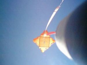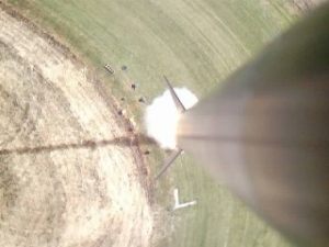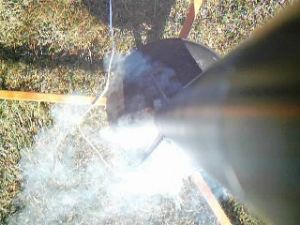 I was afraid of not getting enough speed on a G80, so I loaded up a H128 at Tripoli Quad Cities. I had no problem with the LCO to set up the camera and launch first. The rocket flew a little off due to the uneven drag of the shroud but it was pretty stable. The rocket landed and I got video, which you can download at my web site, off the SD card. Being consumed with need to put a big motor in it on the very same day, I loaded up a H268R. The rocket kicked off the pad super fast--I wouldnt be surprised it if broke mach, arched over, still coming down, still coming down.....!@#$%%!!! It landed on a soft dirt field about 300 feet away from the pads. The entire payload section was buried, and the camera was TOTALLY destroyed. However when I looked in the camera, I saw that the SD card was still intact!!! I am in the process of getting a new camera now so I will be able to see crash footage. The booster section of the rocket is in pretty good shape, only one small kink between the centering rings, but everything 3in forward of the centering rings will need to be replaced. Upon inspection, we concluded that the motor failed because of a combination of things: not enough ejection powder (although I had the same as the H128), too tight of a fit for the coupler, and very, very high thrust crushing everything down (including payload).