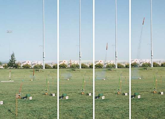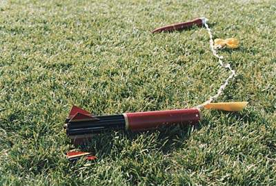 A nice flight too, angled slightly into the wind and going up nice and smoothly. Everything went smoothly, including ejection but the parachute never totally unrolled from the shroud lines so the 1 1/2 pound rocket came down on a poor streamer.