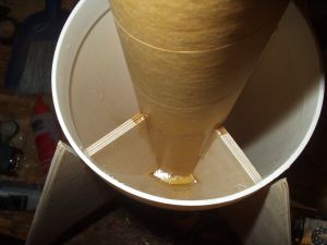 I placed the notch centering ring on top of the tail cone and dry fit it into position to assure the proper alignment while gluing. I allowed this to fully cure before removing the top centering ring. Once it was removed, a full set of internal and external fillets was applied (external, internal to the motor tube, internal to the exterior wall of the tail cone.