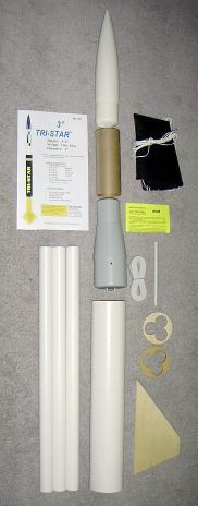 The kit picture, specifications, and motor suggestions insert are printed on one side of a single 8x11 page with the 20 steps of assembly instructions printed on the back. There is one diagram to assist with the centering ring placement, motor mount assembly, and fin alignment. A notation on the front page of this sheet states "This kit recommended for persons with previous model rocket building experience". I do agree with this suggestion and found the instructions to be sufficient and easy to follow. If you have built a few LOC kits before attempting this one, you should have no problems understanding the assembly instructions for the Tri-Star.