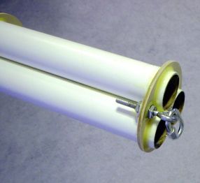 The next step is to glue the motor mount assembly into the airframe tube. I decided to postpone this step until later and epoxy the fins between the motor tubes first. I found it easier to work with the fin mounting procedure without having an additional 17" of main airframe tube attached to the 22" long motor mount assembly. Its easier to handle this way. I beveled the leading and trailing edges and put a smaller bevel on the root edge of each fin with a belt sander, then coated each fin one side at a time with finishing epoxy. Normally you would not bevel the root edge of a fin however this step is recommended in the instructions and if you use wedge fin attachment it makes for a much better wedge fit between the motor tubes. I then sanded both sides of each fin with a palm sander and then bonded each fin into the motor mount tube valleys using a fin alignment template that I cut from a piece of scrap cardboard to aid with the fin alignment. I then attached the shock cord to the eyebolt with a quick link and fed the shock cord back through one of the motor tubes to prevent epoxy from getting on the cord. Finally, I bonded the motor mount assembly into the airframe tube.