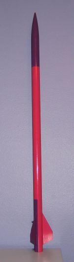 Decals aside, I kept the finishing work simple like the rest of the rocket. The fins were sealed with Elmer's Fill 'n' Finish and then sanded smooth. The tubing has slightly noticeable spirals but I didn't feel that they were enough of an issue to warrant filling them. The rocket was then primed with Krylon white primer, sanded with 400 grit sandpaper, and then primed and sanded again. Finally I had myself an excellent opportunity to apply a color I'd been wanting to use for some time: Krylon Gloss Watermelon. It's not too soft a pink to be considered feminine (not that there's anything wrong with that) but it is such an eye catching color! I added Krylon gloss purple as an accent color--another great color that should be great for helping locate the rocket in the field! I painted a couple of fins and halfway around the body tube so I can easily track any rotation during flight. For a final touch, I added some automotive pinstriping.