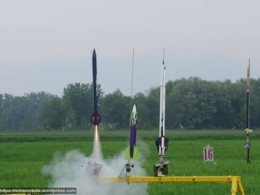 I started off with the Lunar Eclipse Jr. on an E9-6. This one, recall, flew well on its first flight about three years ago. A week later it hung up on the launch rod on the first attempt to fly it, and it was damaged in a motor cato on the second. A year later, finally repaired, it arced over for a long walk, and when I found it my reload casing was missing. And last year at NYPower after a launch failure due to shorted clips it arced over again for another long walk.