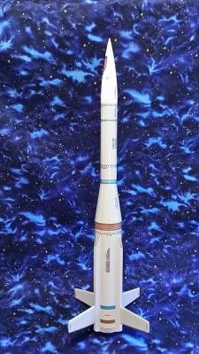 This rocket was a challenge all the way around. It has a transition and air intakes that are made out of cardstock. It also features through-the-tube fin construction. Painting was a struggle. I had to make several attempts due to poor spray paint quality. Finally complete, I think it looks great!