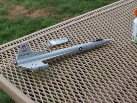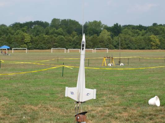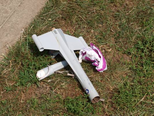 Third NARAM for this bird. Great flight, but chute didn't deploy on recovery. Hit the roof of the shelter, but only scraped a fin. Later blew off of the RSO table and re-broke a fin that was broken ten years ago at my first QUARK launch.