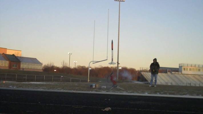 Cold outing, 26 deg. Parachute got hung up on fin. End of BT got crunched, popped a fin. Quest altimeter in payload. We can rebuild him.