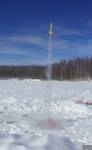 Mini Honest John Flight First flight of the day was good but the nose cone and parachute failed to eject and the rocket was a lawn dart. Fortunately there was about 6" of snow on the lake and it was recovered with out damage. Second flight was perfect with parachute deploying but the motor did not eject from the rocket. ... [More]