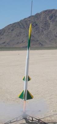 Nice boost, guick and high. Arcing over, still nose up at ejection. Good chute, minimal drift. Had to run a bit to get under it and missed the catch. Lakebed landing, no damage.