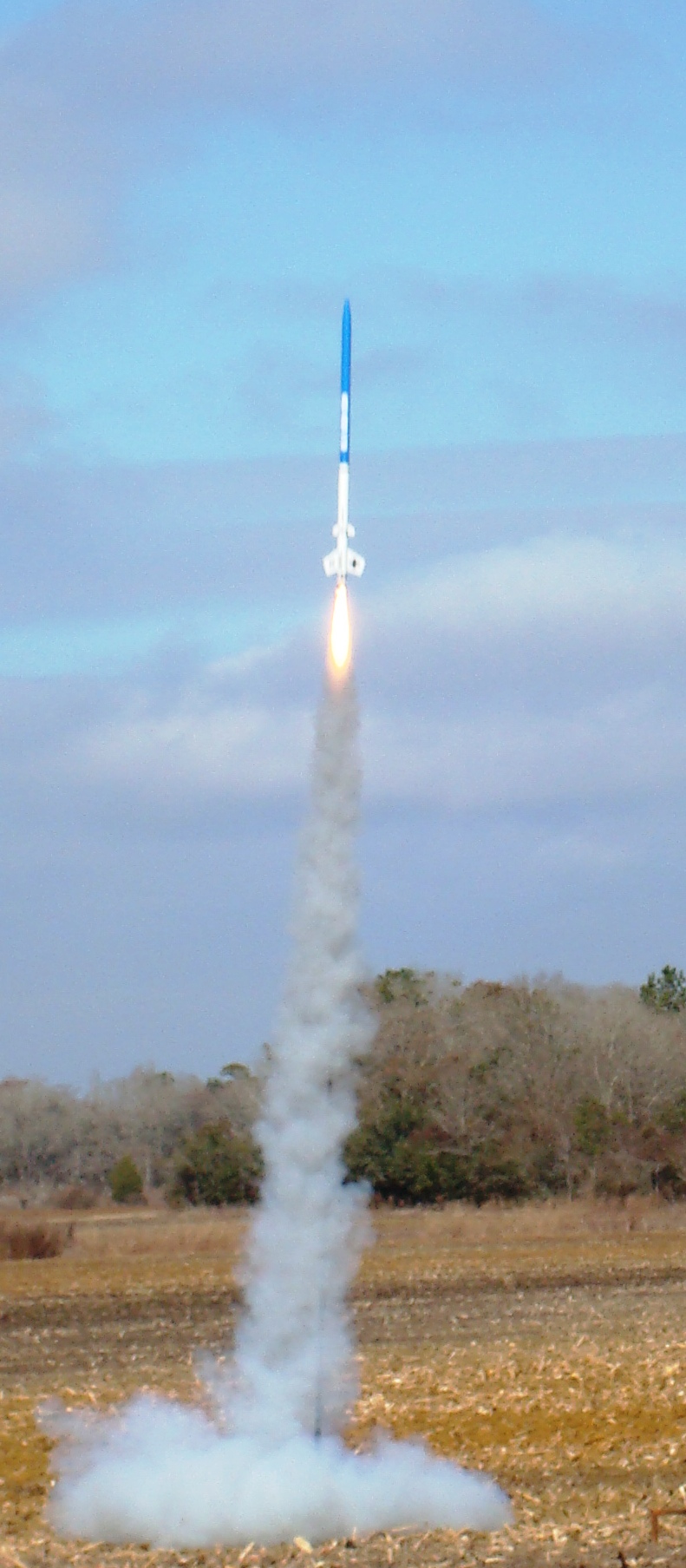 Nice flight of the Blue Bird Zero upscale. Swapped the delay element out to get an 8 second delay. Straight and smooth off the rail, arcing into the wind at the top of the climb. Still nose up at ejection, good chute, fair amount of drift on the way down. Mud landing on the field, no damage. Flow with a Jolly Logic Altimeter II with the following data reported: Burn Time: 1.3 sec, Peak Acceleration: 14.0g, Average Acceleration: 9.5g, Coast Time to Apogee: 6.7 sec, Ejection 0.6 seconds prior to apogee, Ejection Altitude: 1742, Desent rate: 14 MPH, Flight Duration: 91.5 sec, Peak Altitude: 1811 feet, Peak Velocity: 266 MPH.