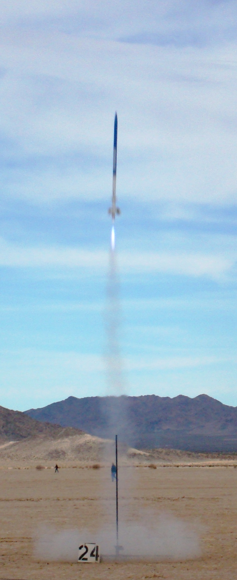 Accidentally drilled the dealy down too much so I borrowed the delay element from another CTI 29mm motor.  Quick off the rail, nice straight boost, couldn't really see the ejection event against the high thin clouds.  Eventually picked up the chute coming down.  Good chute, Minimal drift, landed next to the low power pads.  Post flight inspection showed one of the small forward fins missing (found at the March launch), lots of blue paint on the main fin below the missing fin, and a serious impact dent in the upper body tube.  Either got unlucky, or the ejection was early/late, not sure which.