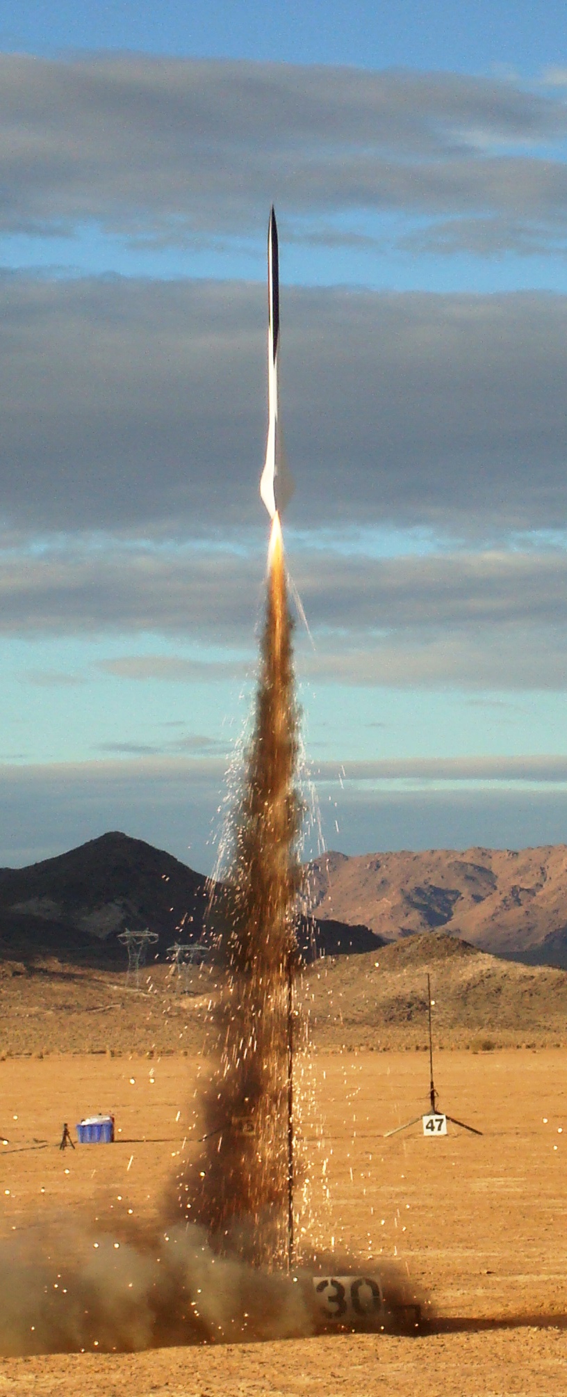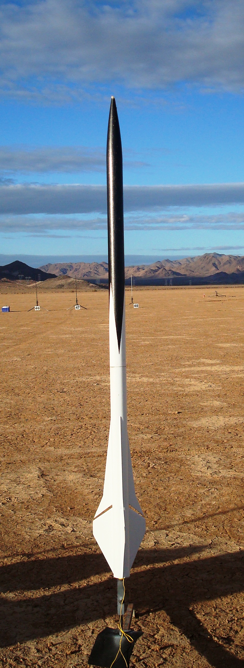 Nice skidmark flight, loud and proud. Great boost, straight and quick. Arcing into the wind at the top of the climb, still nose up at ejection. Good chute, long walk, lakebed landing, no dmage.