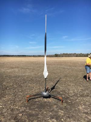 Great flight, rocket took a slight "lean" off the rail and ended up arcing over during the coast to apogee. Heard a nice whistle on the way up which is not a "normal" occurrence for this rocket. Rocket was nose up, still climbing slightly at ejection. Good chute, long time coming down. Rocket got noticeably hung up in a couple of thermals on the way down and just seemed to hang in the sky. Landed on the field with no damage.
