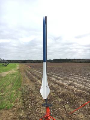 Great boost, straight, fast and high on a big black sparky exhaust plume. Lost sight of the rocket against/in the clouds during the coast and never picked it up under drogue. Heard the main charge go off at 500 feet and located the rocket way out near the far edge of the field. Recovered with no damage after a long walk.