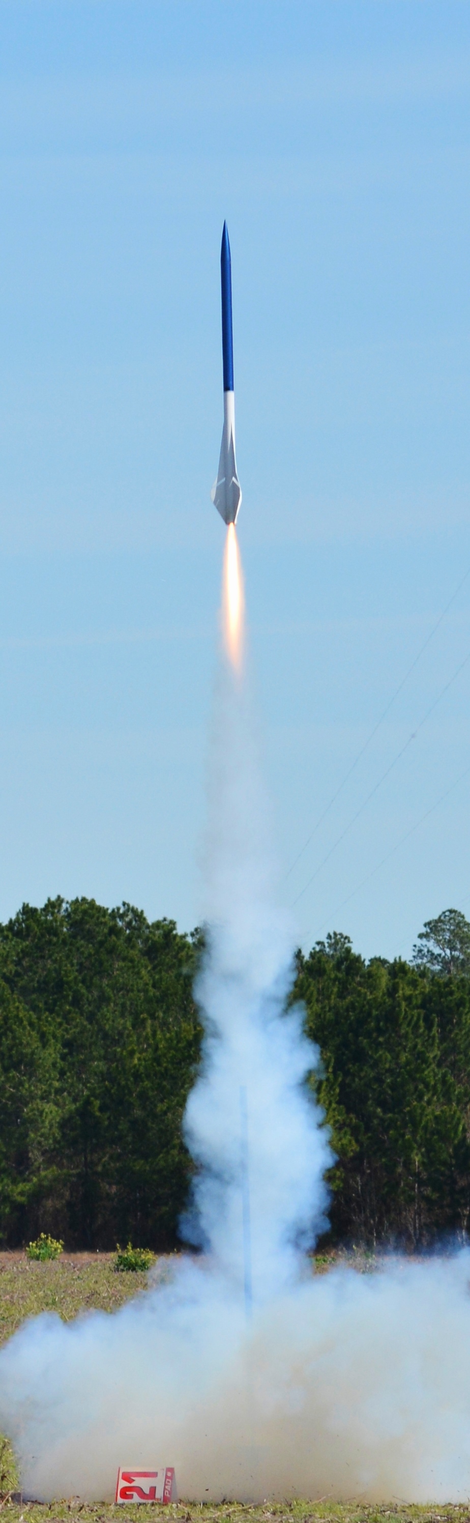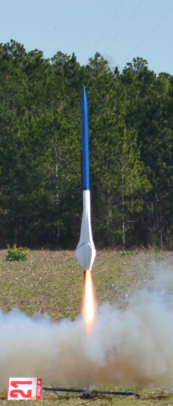 Finally got my hands on one of the latest CTI 38mm longburn motors and went for broke!  Great boost initially, looked real nice coming off the rail.  Picked up a pretty good lean to the right about 100 feet off the ground and kept going untill it was out of sight.  Could not see or hear the apogee event.  Had a good signal from the tracker and after a couple of minutes several folks saw the main come out well off the field and over the trees.  Tracked it visually and was hoping that it might have landed on a small field near the access road.  Started the long walk and a fellow on an ATV offered me a ride.  Got close and started hunting with the tracker.  had to backtrack a bit but eventually spotted the drogue chute in some high brush on high ground surrounded by water.  Couldn't find a dry way in so I hiked back to get my car and my rubber boots.  Got to the landing spot and found the booster section of the rocket in the water.  Recovered everything intact, it will remain to be seen how the back end dries out.  Highest flight I've successfully completed to date by almost 1000 feet, and I'm sure it would have been at least a couople of hunderd feet higher with a straight boost.