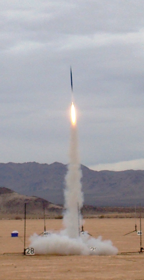 Great boost, straight and fast off the rail, arcing to the east after burnout.  Lost it against the higher level clouds.  Heard the drogue charge fire, and the LCO said he saw it separated but quickly lost sight.  Heard the main charge fire and got eyes on it just before touchdown, straight out from the LCO table, a hundred yards or so beyond the away pads.  Lakebed landing, no damage.  Shock cord from the booster to the av bay severely twisted, although both chutes looked to be deployed clean.