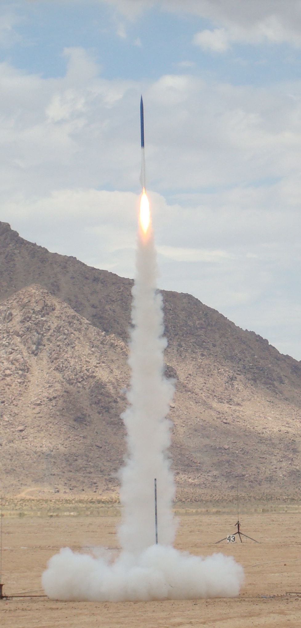 Biggest flight yet for Slick Willy! Borrowed a tracker and let it rip. Off the rail like a shot, dead straight. Saw the tracking smoke but lost sight of it after drogue deployment. A couple of folks had eyes on it the whole way down. Good main chute at 500 feet. We had a good line on it, but followed the tracker and it took us right to it. Lakebed landing, no damage.