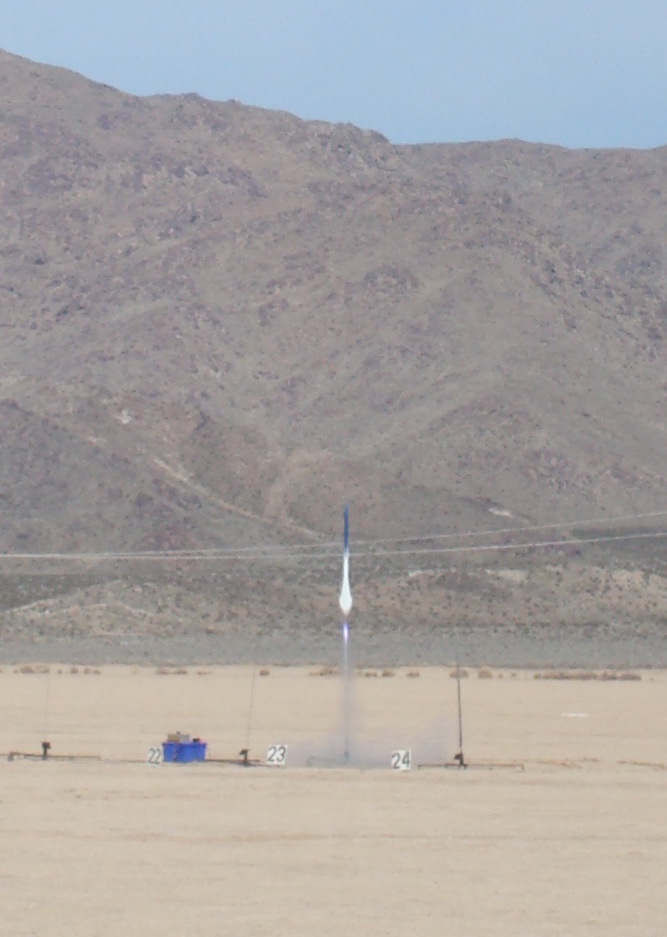 First flight since repair of the payload section. Nice boost on a Cesaroni Blue Streak motor, fast and straight on a very windy day. Arcing into the wind at the top of the climb. Good drogue deployment at apogee, good main deploymrnt at 500'. Lakeed landing probably 1/4 mile away, chute settled nicely, no damage.