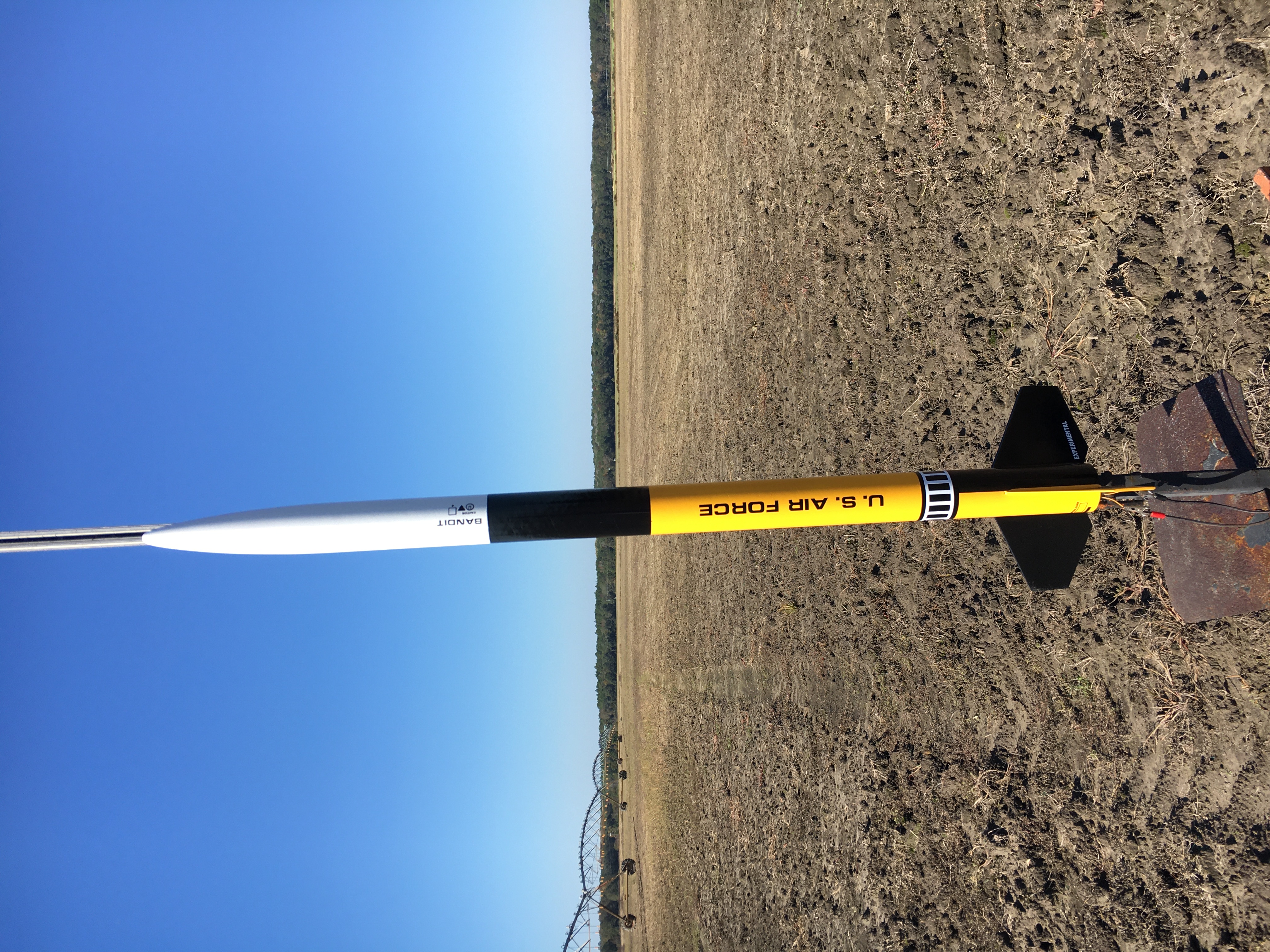 Upscale of the Estes Bandit.  BT-80H tubing, 1/8” plywood fins, balsa nose cone from Semroc, Estes 29mm motor retainer, 30” chute from Spherachutes, 1/8” flat woven Kevlar shock cord, and a Kevlar chute protector from Giant Leap Rocketry.  Vinyl decals from Stickershock.  Designed for G to H impulse motors.