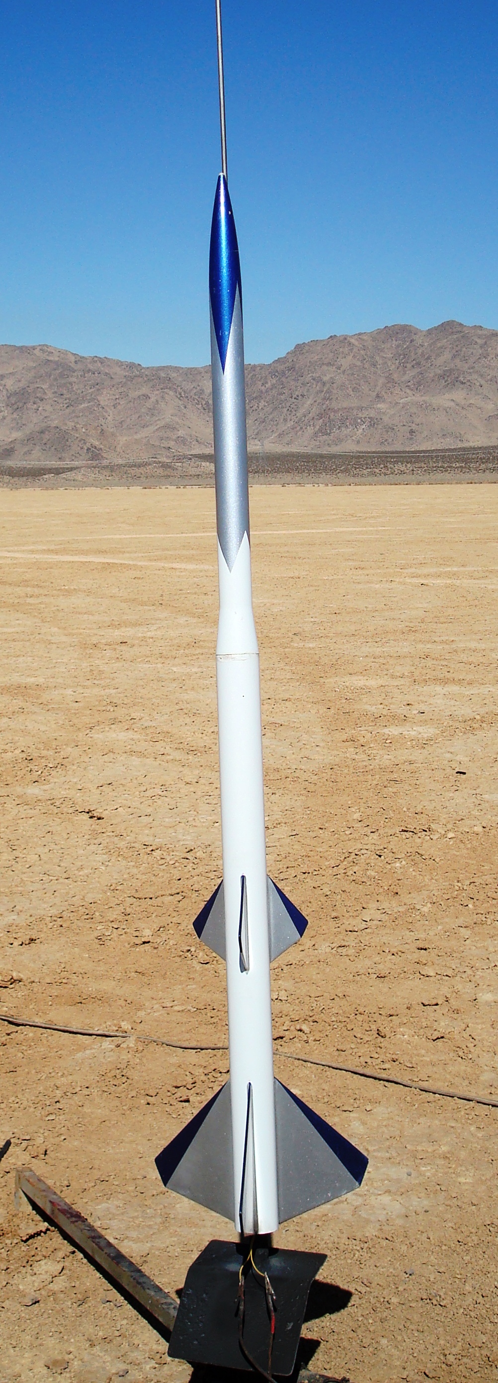 Nice boost, not quite straight off the rod. Arcing over at the top of the climb, still nose up at ejection. Good chute, small amolutn of drift, lakebed landing. No significant damage but the lip of the body tube and the shoulder of the transition are starting to look a little beat up. Jolly Logic Altimeter One used for altitude data.