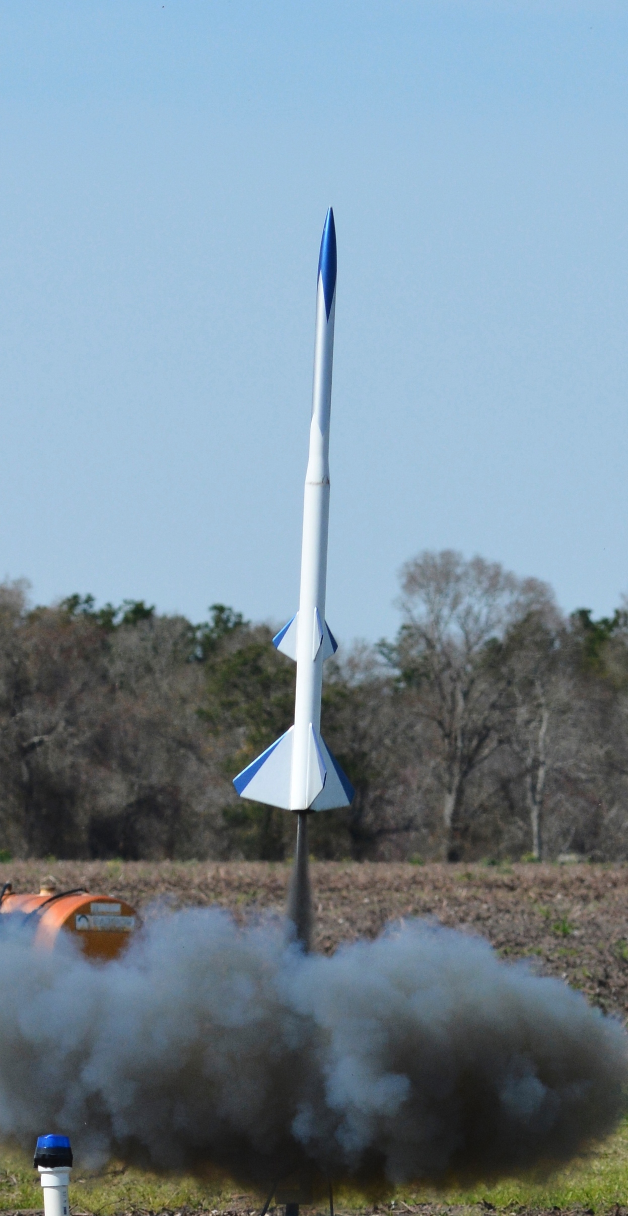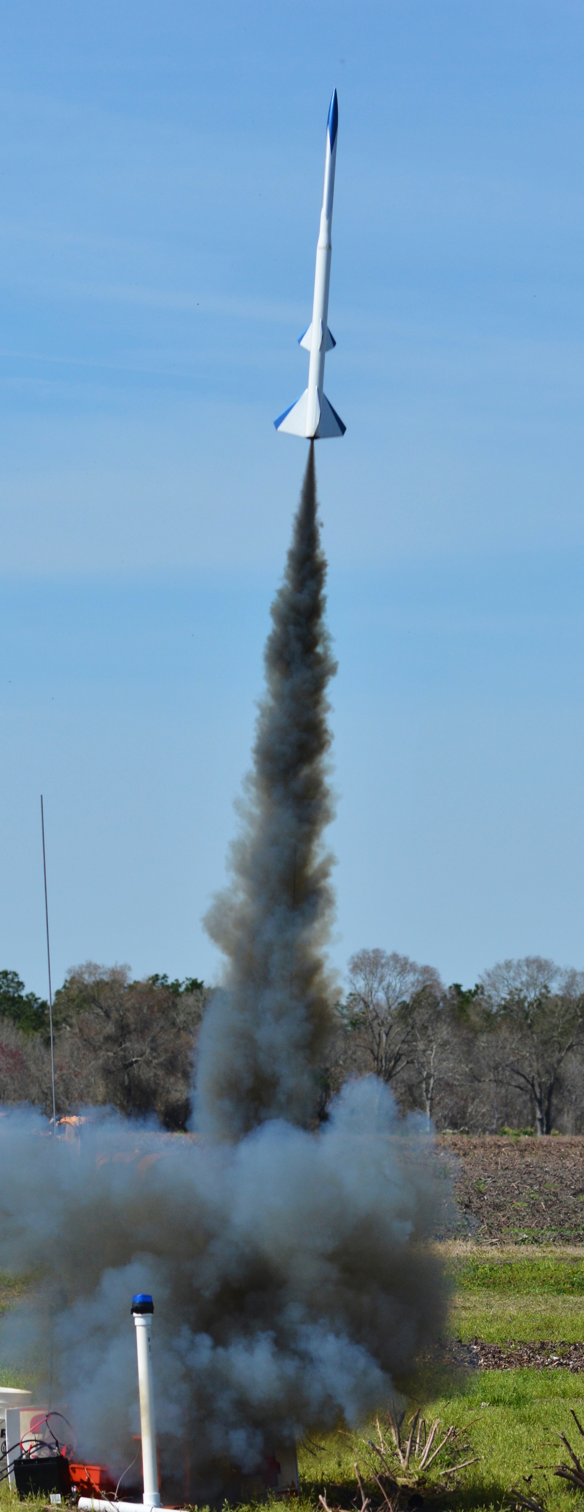 Another motor/rocket combo I've been waiting to try. Nice boost, smooth and straight, arcing into the wind at the top of the climb. Lost sight after motor burnout, but picked up the tracking smoke way up high. Looked to be at or slightly past apogee at ejection. Good chute, long time coming down. Landed on the field, no damage. Flown with a Jolly Logic Altimeter II but the unit did not record any data.
