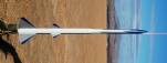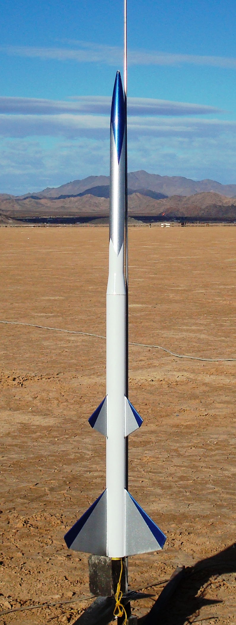 Another nice flight for Bad Zack. Very quick off the rod, arcing into the wind. Near apogee, travelling horizontal at ejection. Good chute, fair amount of drift. Moving with the wind on landing, took a good tumble on the lakebed. Lip of the booster section a bit beat up, still flyable, but will need some attention before too long.