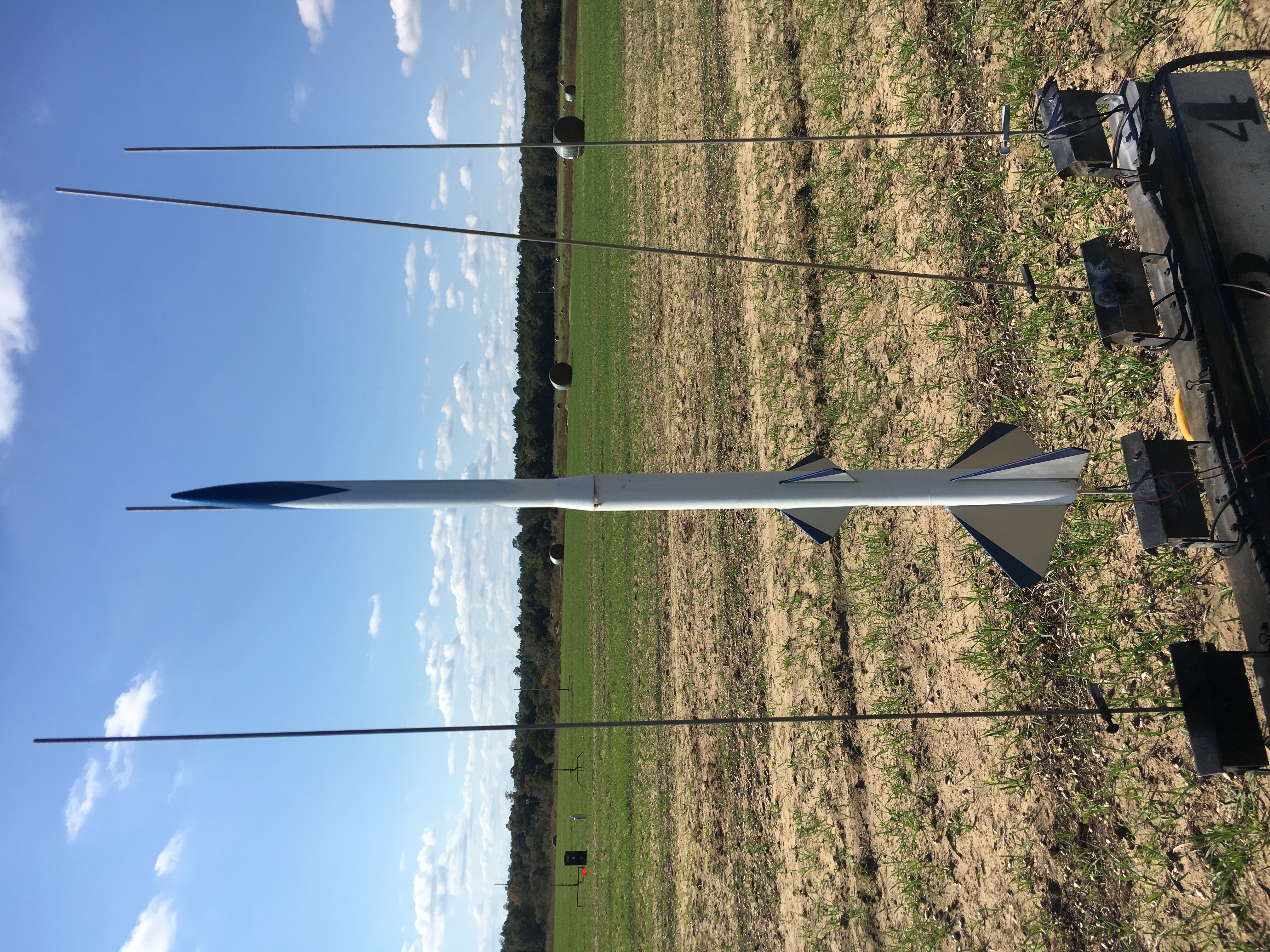 Awesome flight from a veteran rocket. Great boost, straight and fast, stalling out, nose up at ejection. Good chute, long time coming down. Winds at altitude changing direction, pushed it back behind the flight line. Landed at the edge of the sod next to a creek, no damake.