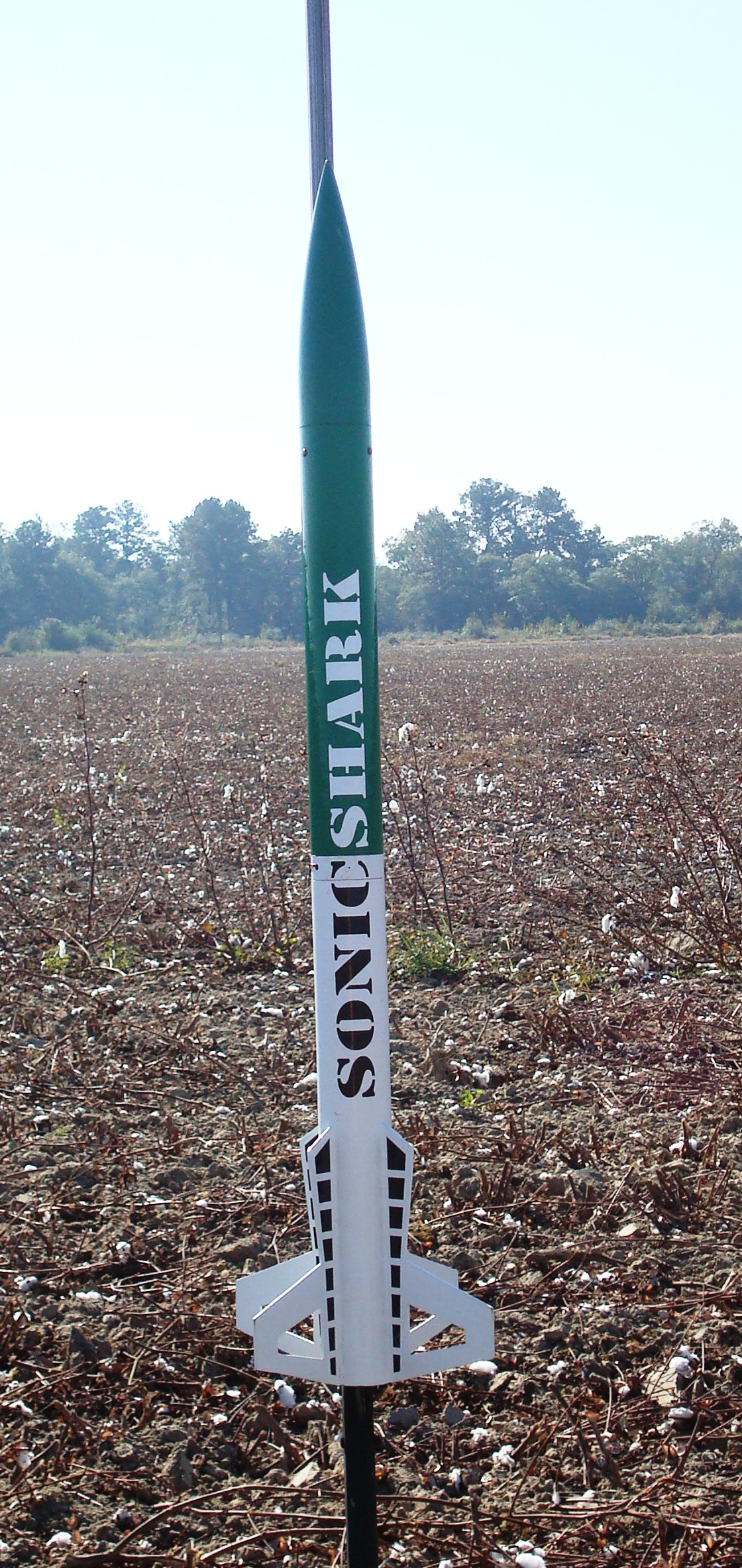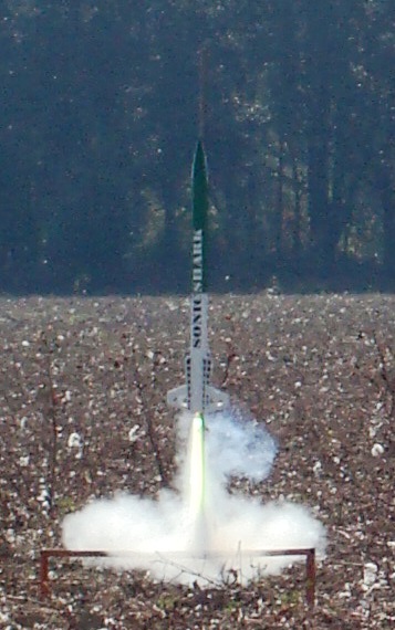 First flight with a new club, the SouthEast Alabama Rocketry Society (SEARS) in Samson, AL which is just over the border from the Florida panhandle.  Flying field used to be a sod farm, now used for growing cotton.  The field had recently been harvested and disced, made for a long tough day of recoveries.  Great boost on a bright green flame, very fast off the rail.  Arcing over a bit back over the flight line during the coast.  Good drogue deployment at apogee.  Significant drift at altitude towards the edge of the field.  Clean deployment at 500 feet, took the chute a couple of seconds to unfurl and deploy.  Landed off the edge of the field in the trees.  Found the upper payload section on the ground with the booster section about 40 feet up in a tree.  First couple of tugs didn't do much, but I was able to walk around the tree a bit and get a better angle to pull the rocket down with no damage.  Little bit of lick never hurts.