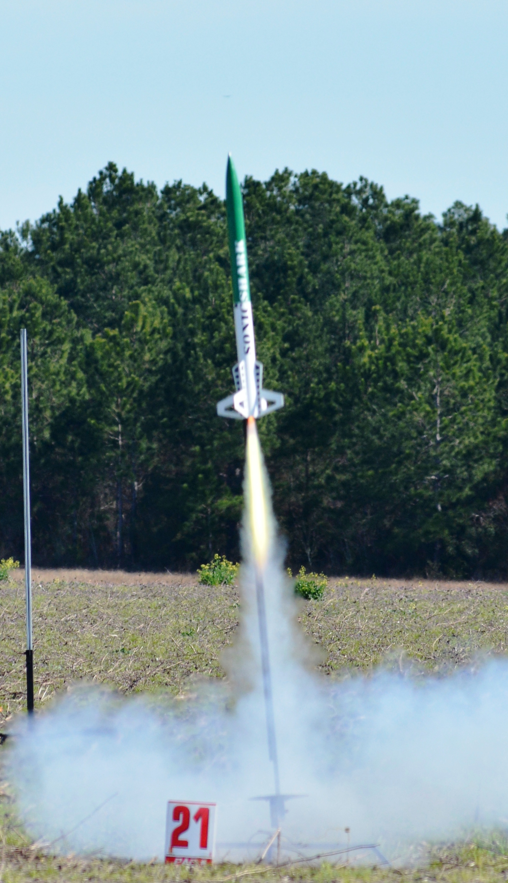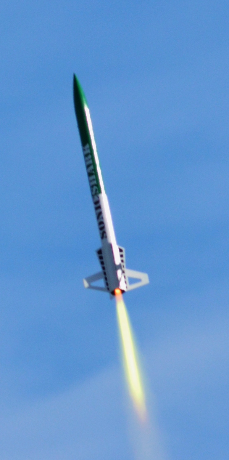 Finally got the nerve to put a "J" in the Sonic Shark. Great boost, straight and fast off the rail. Arcing over at the top of the climb, heard the apogee charge but didn't see the event. Several folks had eyes on it and eventually I was able to spot it as well. Good main deployment at 500 feet. Landed next to the away cell, the booster section clipped the irrigation rig on the way down with no damage sustained.