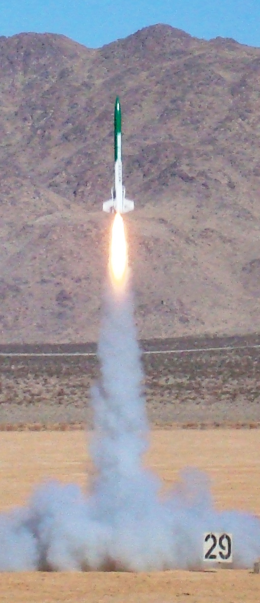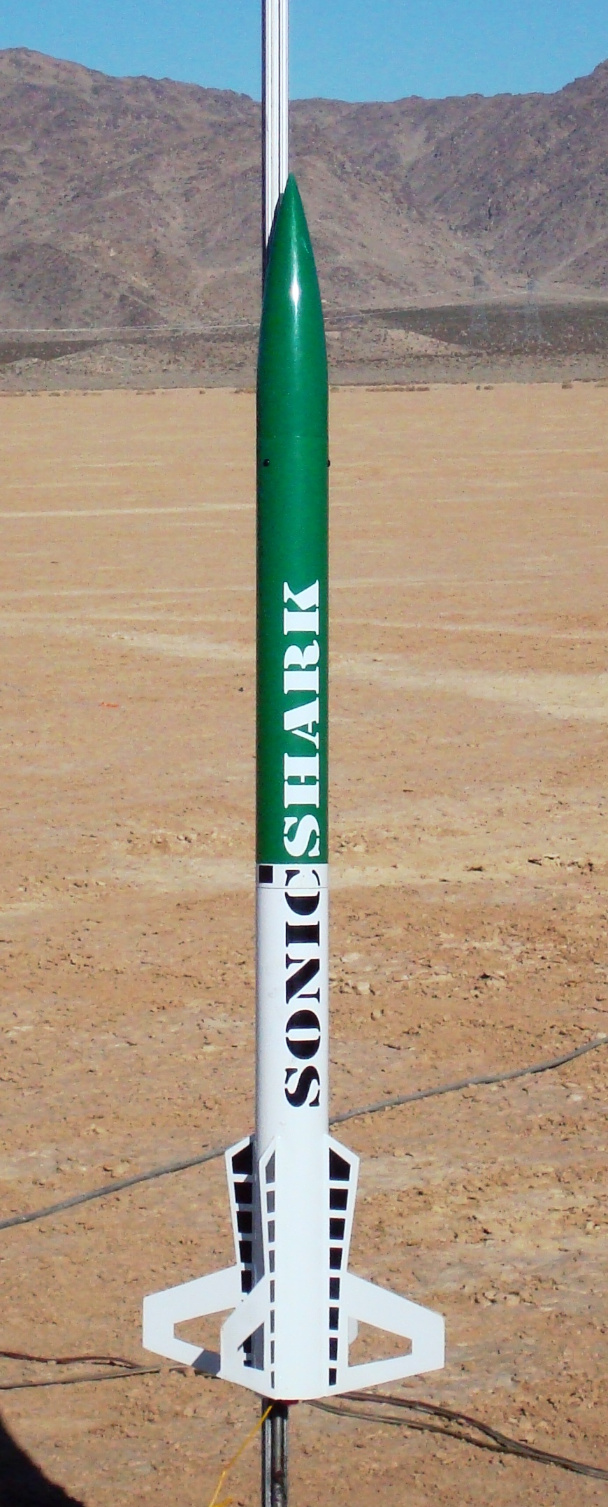 Great Flight from the Shark! Awesome boost, straight and fast. Arcing over just at the top of the climb, good drogue deployment at apogee, good mina deployment at 500 feet. Perfect lakebed landing, laid out nicely, no damage.