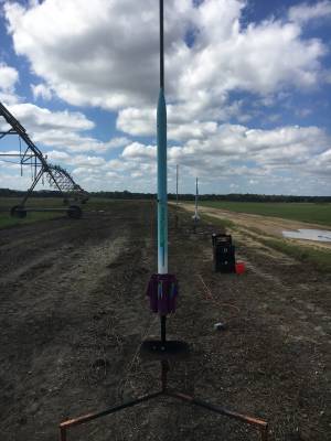 Great Tube Fin Flight!  Straight, fast and loud off the rail, slowing down quick after motor burnout and moving in the wind.  Arcing over at the top of the climb.  Good drogue at apogee, good main at 500 feet.  Long walk, landed on the sod, no damage.