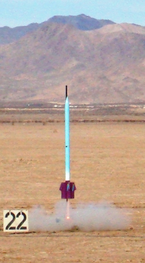 Didn't get good continuity tones from the altimeter on the first trip to the pads. Back at the table found that one of the leads to the drogue charge had broken off at the terminal block. Re-attached the leads and got a good chack. Another great flight! Straight and fast of the rail, slowing down quick after burnout. Good drogue deployment at apogee, drifting a little bit up high. Good main deployment at 500 feet, lakebed landing, no damage.