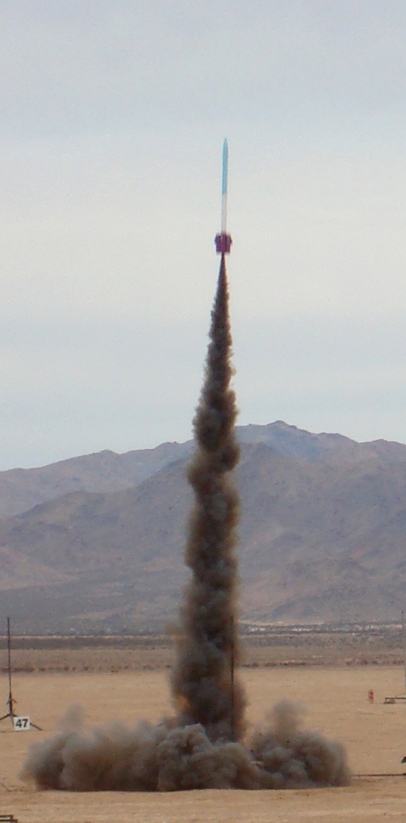 Spent the morning setting up the range for ROCstock XXXIV in beautiful weather. Got cloudy and a little breezy by the time we were finished. Nice boost, smooth and fast, arcing into the wind at the top of the climb. Good drogue deployment at apogee and good main deployment at 500 ft. Fair amount of drift, lakebed landing, chute piced up in the wind a few times, but no dragging. No damage.