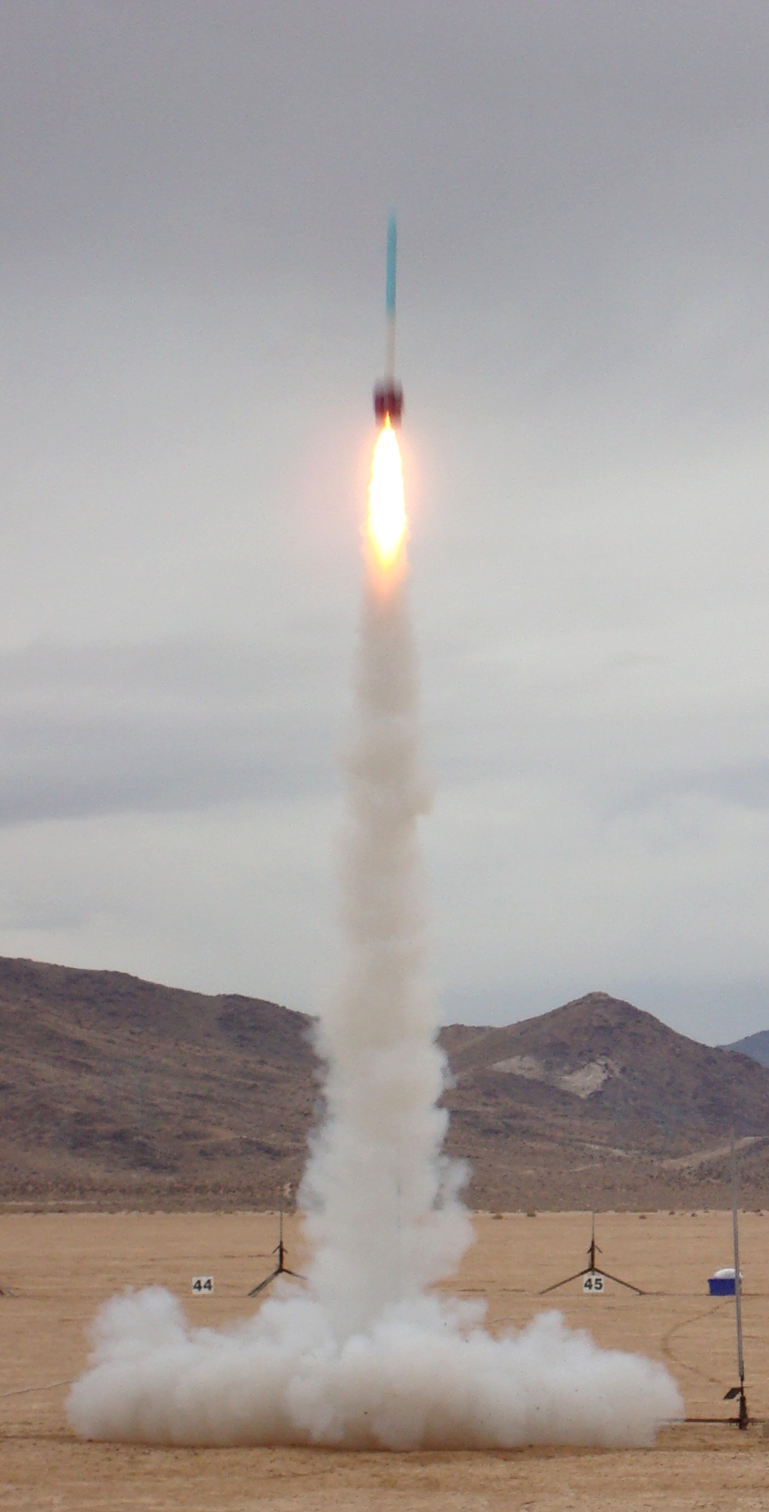 Great boost, fast and straight off the rail, slowing down quick after burnout.  Good drogue deployment at apogee.  Heard the main charge fire at 500 feet but no main.  Main payload section looked like it had already seperated.  Lakebed landing under dgugue, no damage.  Avionics bay was separated from the main chute compartment and the main ejection charge was still attached to the bay.  Looks like when the drogue charge went off the payload bay must have hit the end of harness hard enough to pull the avionics bay and main ejection charge loose.  Might need to re-think the whole friction fit concept.