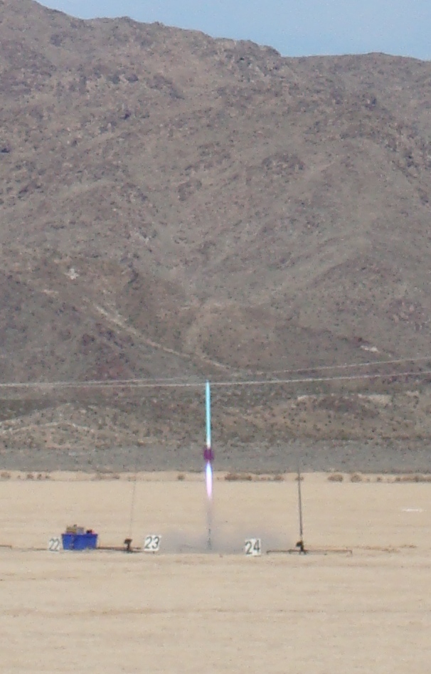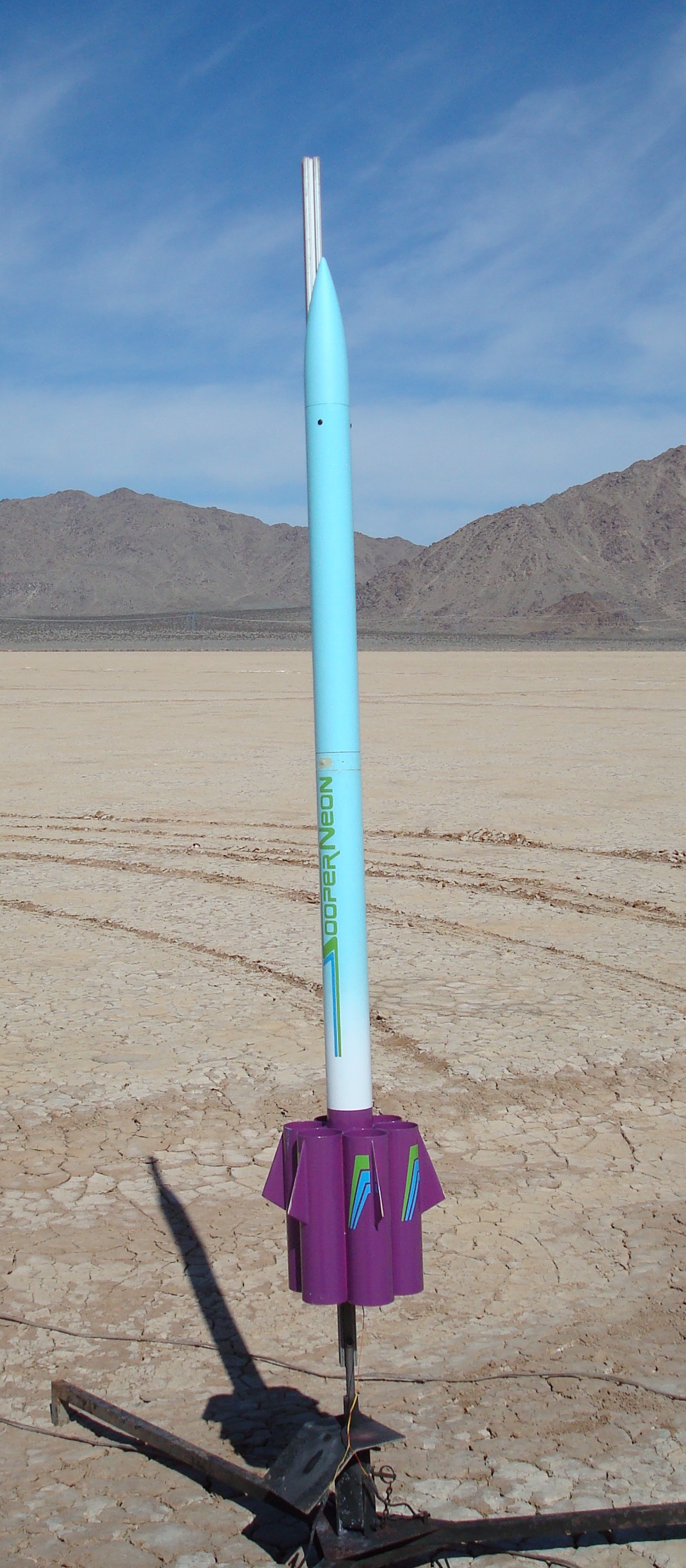 Great flight of the Sooper Neon!  Straight, Fast boost on a big blue flame.  Slowed down quick after burnout, arcing over at the top of the climb.  Good drogue deployment at apogee, good main deployment at 500'  Landed on the lakebed about 1/4 mile out.  The main chute caught the wind and the rocket got dragged a couple hunderd yards before I caught it.  No major damage, but starting to look a little beat up.
