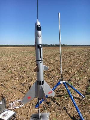 An upscale of the classic Estes Wolverine based on standard LOC 2.63" tubing. Rocket has a 29mm motor mount with an AeroPac retainer. Fins are made from 1/8" plywood, with the main fins being TTW to the motor mount. Nose cone was constructed from an ogive balsa cone with the distinctive canopy carved from a separate balsa block. Recovery system uses a 1/8" flat woven Kevlar shock cord epoxied to the motor mount and tied to a large screw eye in the nose cone shoulder. Either a 24" or 30" spherachute is used based on the field conditions. Rocket is finished in a silver metallic paint with the usual outstanding vinyl decals provided by StickerShock.