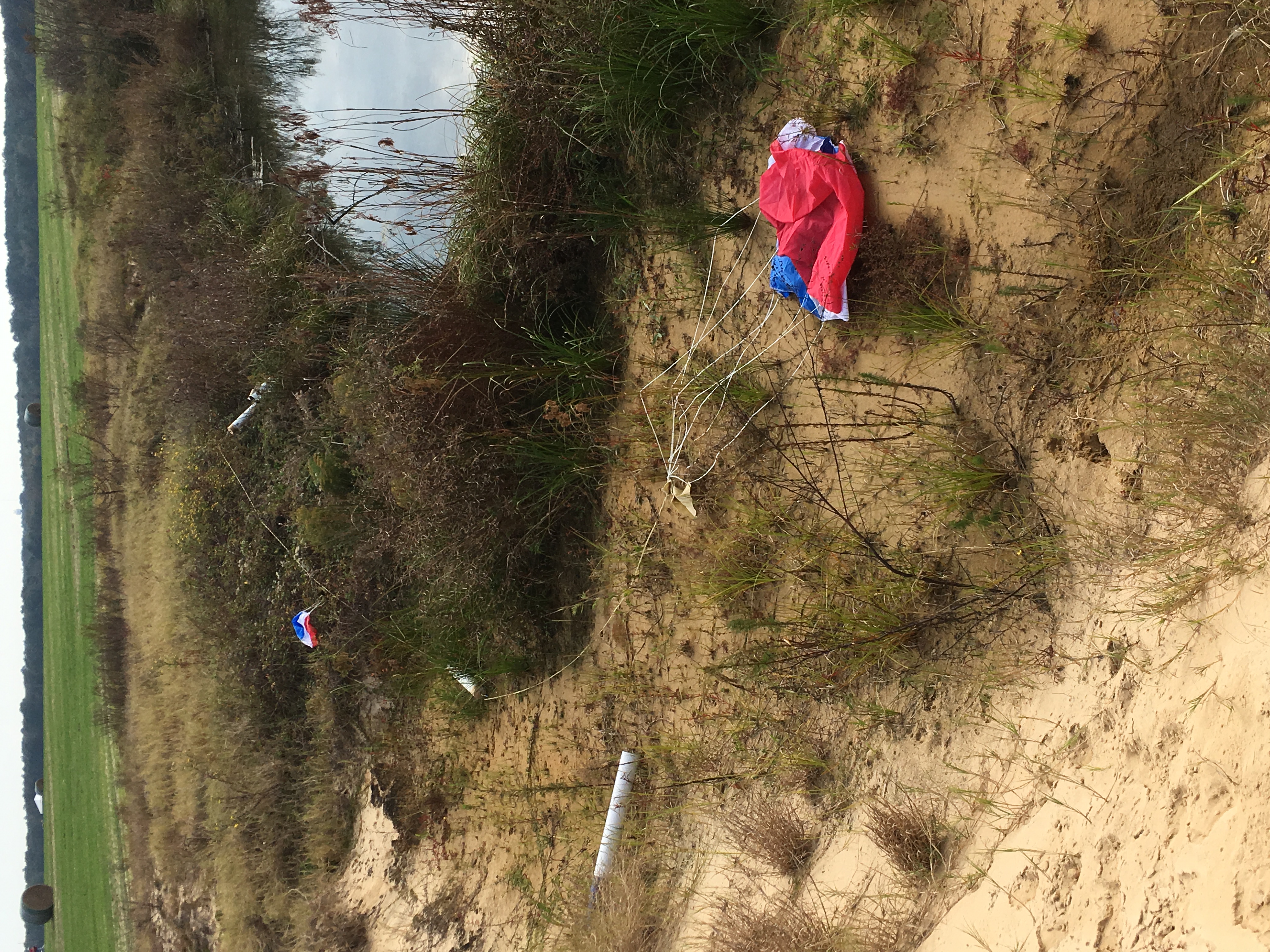 Finally had the right winds to put Old Glory up on a "K" I have had built for several months. Awesome boost, straight, fast and loud off the rail. Good drogue deploymeant at apogee, good main at 700 feet. A little bit of wind at altitude had it out near the back of the field. I wasn't concerned, but when I hiked out to recover it I discovered that the rocket had settled in a nice arc along the shore of a settling pond. I also discovered that the bottom conformal rail guide had torn off during launch (it was found later in the day near the pads). I had mounted the guides on a small stack of "shims" cut from scrap BT to get enough clearance for a rail to feed through one of the tube fins, and one of the BT shims simply tore loose. Should be an easy fix, and hopefully this doesn't prove to be a weak point in the build. The Perfectflite MAWD reported 3823 feet, and the Stratologger reported 3869 feet.