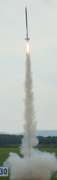 First Flight of the BB29. Awesome boost, straight fast and high. Swapped out the delay element to get an 8 sec delay. Arrcing into the wind, still nose up at ejection. Good chute, long walk, grass landing, no damage!