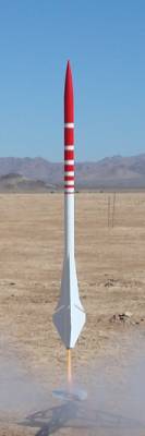 First flight of the Duster in over a year. Nice smooth boost. Long burning E9 put it way up there. Arcing over, still nose up at ejection. Good chute, long walk, lakebed landing, no damage.