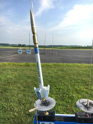 The igniter wouldn’t fire initially, finally cleaned the clips and got a good connection. Decent boost, arcing into the wind. Past apogee and heading downhill at ejection. Good chute, wind brought it back into the corn. Had a good line, found it hanging about 8 rows deep, no damage.
