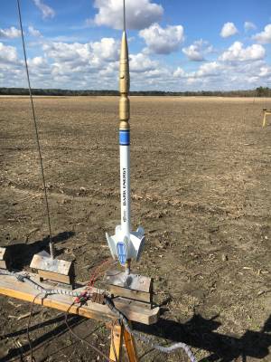 Awesome flight! Great boost, smooth, straight and high. Arcing over, still nose up at ejection. Good chute, short walk, landed on the field with no damage.