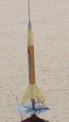 First flight in almost 2 years. Bought this RTF rocket mostly for scout demos, so it doesn't get much use, but today, everyone gets to fly. Nice boost, fast and high. Sill going up at ejection. Good chute, minimal drift, lakebed landing, no damage.