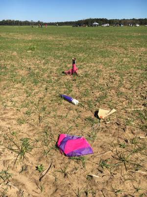 Another great flight from this rocket. Nice smooth, high boost. Arcing over at apogee, more or less horizontal at ejection. Rocket descended under the Jolly Logic Chute Release, which released the chute on cue at 500 feet. Stuck the landing on the field in the soft dirt.