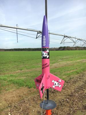 Winds finally picked up enough to break up the cloud deck enough to fly high. Awesome boost, straight and fast off the rail on a big red flame. Way up high, arcing over at the top of the climb, ejection right around apogee. rocket descended under the chute bundle and the Jolly Logic Chute Release did its job perfectly at 500 feet. Rocket stuck the landing on the field, no damage.