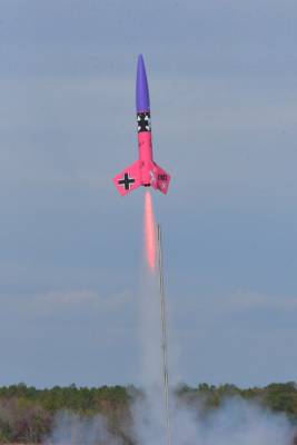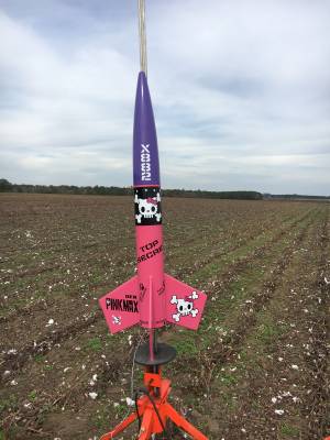 Great flight of the Mega Pink Max! Awesome boost, super fast and straight off the rail on a beautiful red flame. Stalling out at apogee, just tipping over at ejection. Good separation, rocket moving bit with the wind at altitude. Jolly Logic chute release did its thing at 400 feet and the rocket landed on the field with no damage. Shock cord was extremely twisted but it didn't seem to affect the chute release at all.