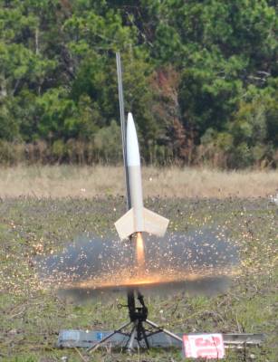 Second "Nekkid" flight of the Mega Pink Max.  Great skidmark boost, loud and pround off the rail.  Arcing into the wind at the top of the climb.  Over the top and pointed down at ejection.  Good chute, wind brought it fairly close.  Mud landing on the field, no damage.  Actual altitude about 450 feet less than the initial sim so that will need some work.  Flown with a Jolly Logic Latimeter II which recorded the following data: Burn time - 1.0 sec, Peak acceleration - 20.9g, Average acceleration - 16.3g, Coast to apogee 8.3 sec, Ejection 3.7 seconds after apogee, Ejection altitude - 1505 feet, Descent rate - 17 MPH, Flight duration - 70.6 sec, Peak altitude - 1650 feet, peak velocity - 373 MPH.
