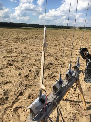 Second attempt, this time with the rubber bands routed properly. Very nice straight boost, stalling out and tipping over at ejection. All blades deployed but the rocket ended up in a nose down attitude and never really started spinning as it wafted back down to the field. Batter than the first flight but still not as intended. No damage, will have to keep trying to make it work.