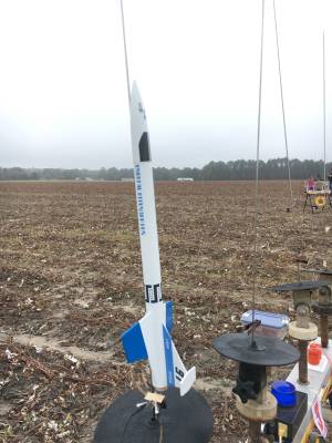 Day two of GRITS 2018.  Not quite as foggy as day 1 but still damp and cold in the morning.  Cloud deck estimated at 700 feet.  Nice boost, little bit of tail wiggle under thrust, arcing slightly during the coast, out of sight in the clouds prior to ejection.  Heard the ejection charge and picked it up under chute.  Landed on the field with no damage.