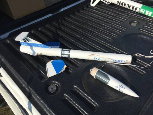Rocket went unstable after clearing the rod, did several low loopy-flips and ended up pointed down, striking the tarmac shortly after motor burnout. Significant damage.